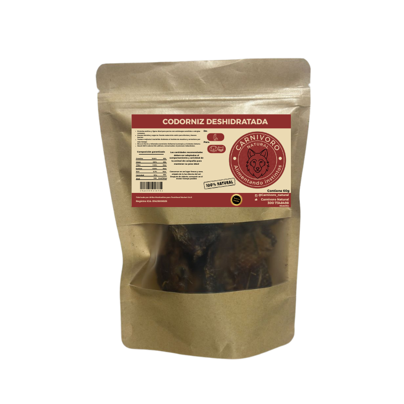Nuestra Codorniz Deshidratada Carnívoro es una fuente natural de proteína magra, hierro y aminoácidos esenciales, ideal para perros de todas las edades. Elaborada con codornices enteras deshidratadas a baja temperatura, conserva su sabor original y todos sus nutrientes, sin conservantes ni químicos.